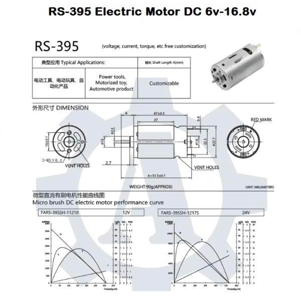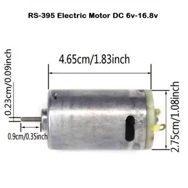 Κινητήρας μotor RS-395-DC 6 -18V με μήκος άξονα 0.9 mm και διάμετρο 2.3 mm, που τροφοδοτείται από DC 6 -18V.